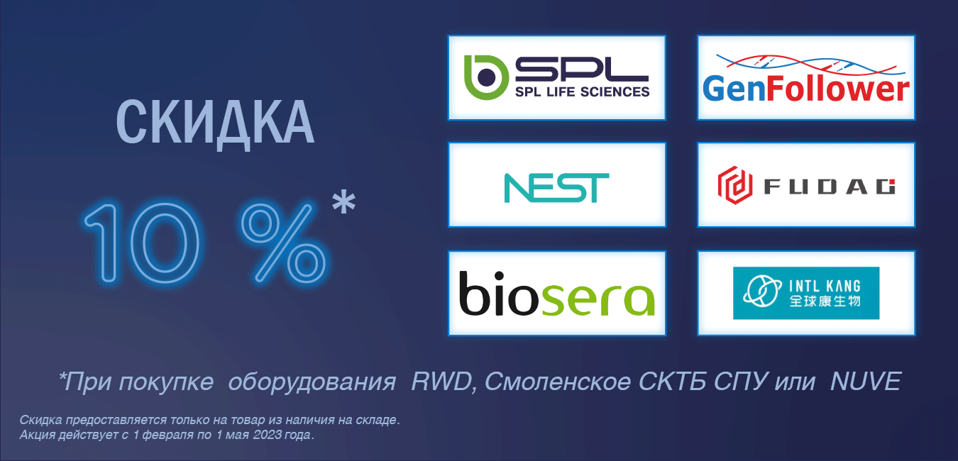 При покупке любого оборудования компании RWD, Смоленское СКТБ СПУ или NUVE клиенту предоставляется скидка 10% на всю продукцию компании SPL, Fudau, GenFollower, Nest, Biosera и INTL KANG.