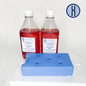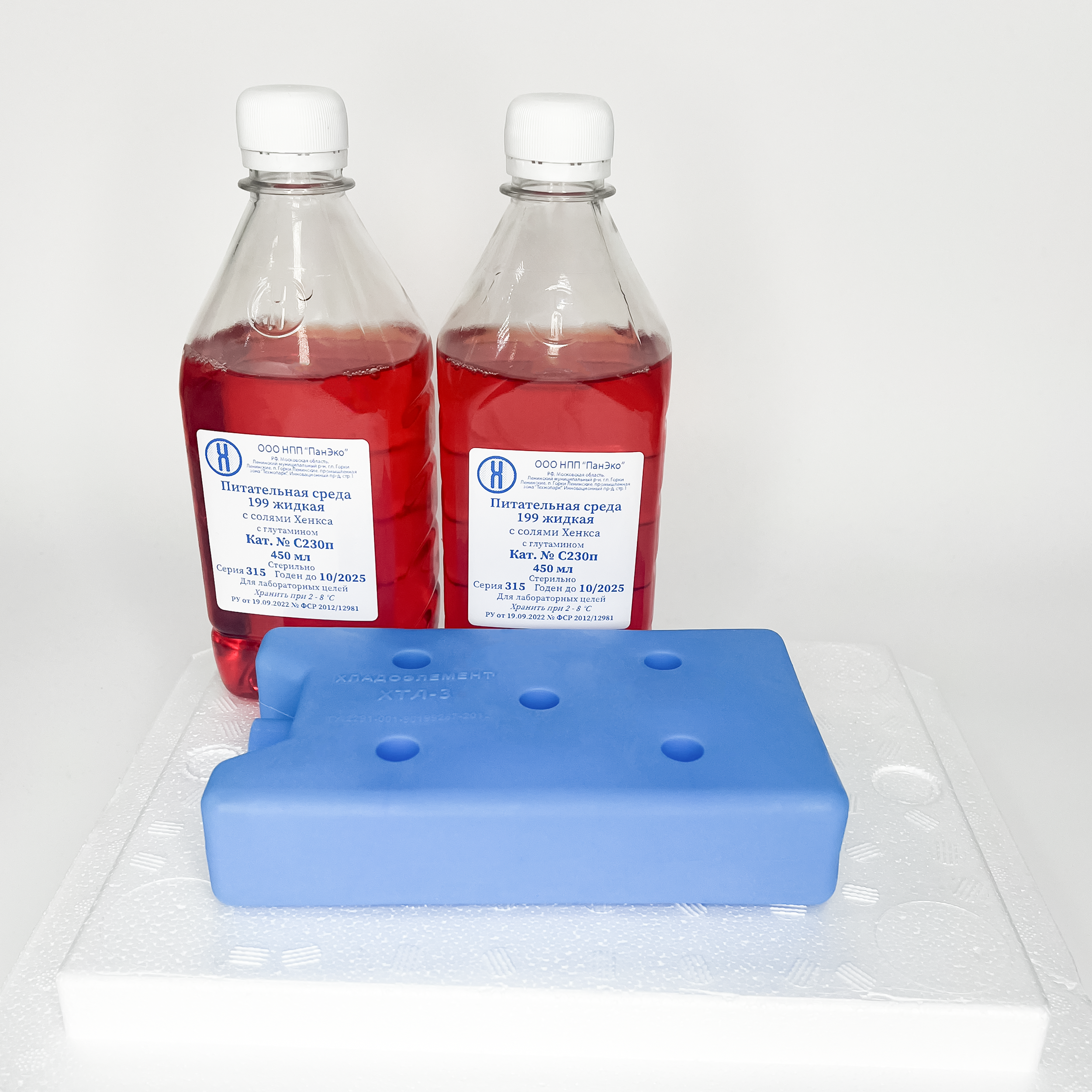 Для заказа доступна питательная среда 199 с солями Хэнкса и глутамином, она продается комплектом из двух флаконов по 450 мл с термоконтейнером ТК-5.