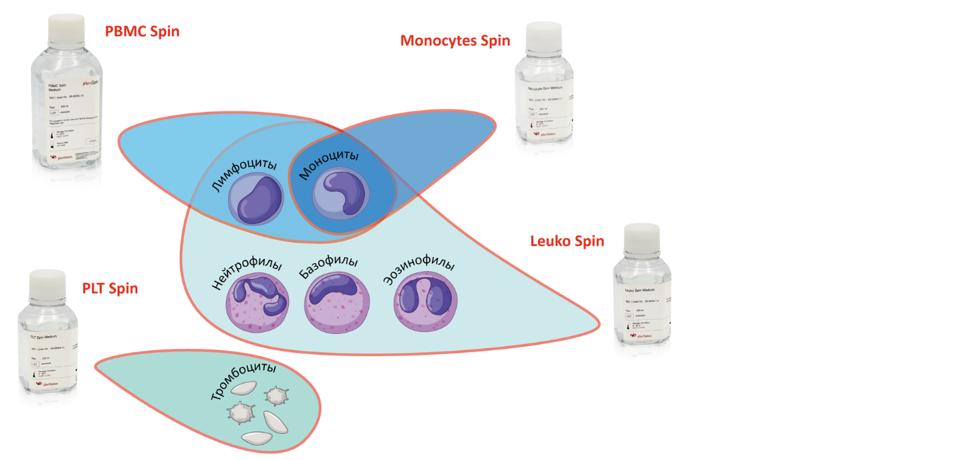 Компания pluriSelect предлагает среды для выделения клеток из цельной крови, препаратов костного мозга или лейкоцитарной плёнки в градиенте плотности. Линейка сред для выделения позволяет готовить как одноступенчатый, так и двуступенчатый градиент. Двуступенчатый градиент на основе среды Leuko Spin в сочетании с другими средами серии позволяет прицельно выделять нужную фракцию жизнеспособных клеток за один цикл центрифугирования.