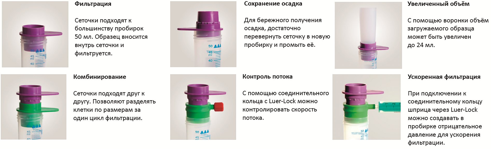 Подходят для пробирок объёмом 50 мл. Поставляются стерильными в индивидуальной упаковке и нестерильными. Неавтоклавируемые, дезинфекция при помощи 70% этанола. Обладают рядом конкурентных преимуществ: