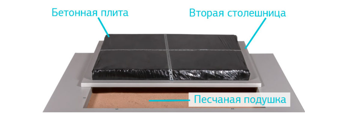 - 3 слой: малая столешница. Малая столешница прикреплена к бетонной плите, полностью её закрывает и не соприкасается с основной столешницей (а, значит, не передаёт от неё вибрации).