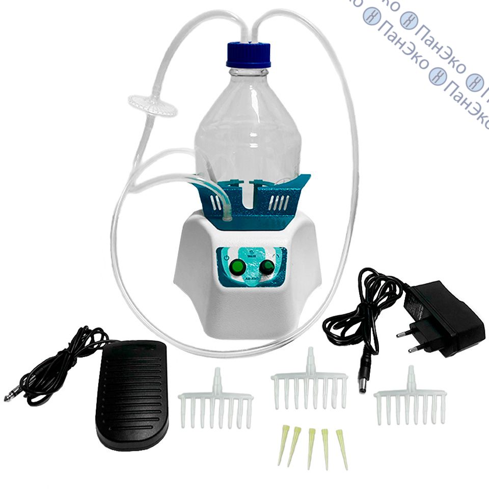 Сосуд соединён полиэтиленовой трубкой с аспирационным наконечником (его объём 200 мкл), которым и убирают жидкость из планшета или пробирки. Подсоединение наконечника универсальное, входящий в комплект наконечник можно заменить на наконечник такого же объёма (200 мкл) любого другого производителя.