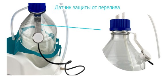 Для защиты от перелива дополнительно можно приобрести специальный внешний датчик. Датчик сделан из пластика (d28×17 мм), подключается к аспиратору через кабельный разъём (находится под разъёмом для педали) и устанавливается на специальное крепление.