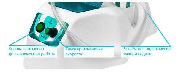 АМ-2000 включается кнопкой на панели или ножной педалью. Педаль используется для кратковременной аспирации, кнопка — для долговременной. Скорость аспирации регулируется тумблером. Для защиты от перелива установлен внешний датчик.