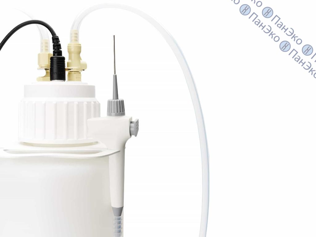 Комплект поставки: вакуумный насос (насос одновременно является подставкой под бутыль), полипропиленовая бутыль на 4 л с детектором уровня жидкости, крышка с фитингами для трубок, защитный фильтр, адаптер для пластиковых наконечников.