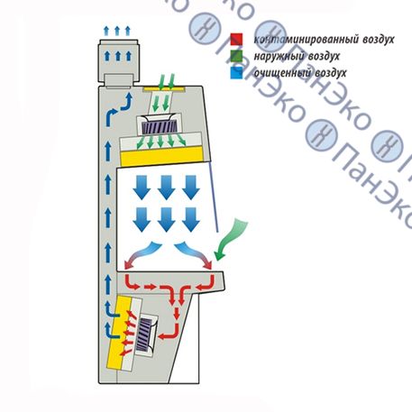 - Контаминированный воздух проходит высокоэффективную очистку и полностью удаляется во внешнюю вытяжную систему.