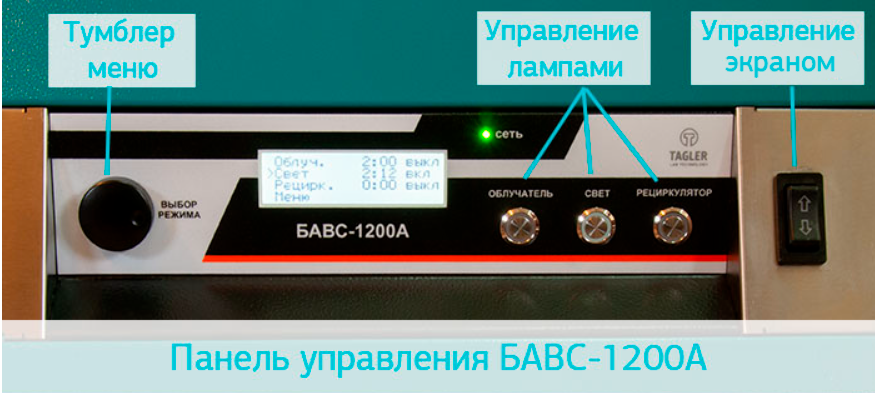 БАВС-1200А оснащён одной открытой ультрафиолетовой лампой и ультрафиолетовым рециркулятором, расположенными в верхней части бокса.
