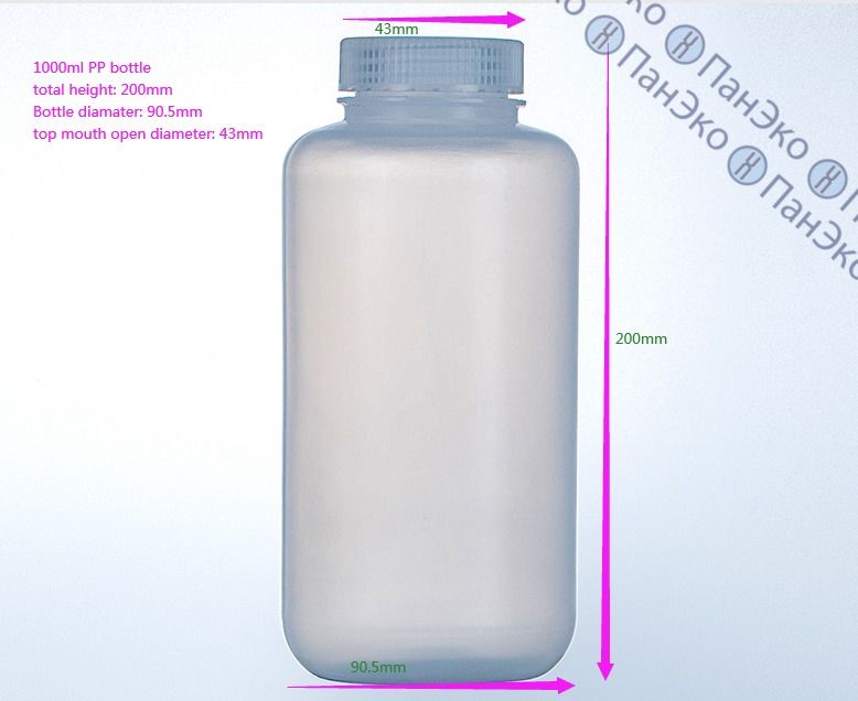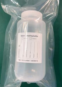 Бутыль объёмом 1000 мл стерильная предназначена для отбора, транспортировки и хранения проб воды. Бутыль изготовлена из прочного полупрозрачного полипропилена. Бутыль имеет герметичную винтовую крышку и этикетку, на которой предусмотрено место для указания даты забора пробы, номера образца, типа воды, цели взятия пробы и фамилии ответственного сотрудника. Каждая бутыль упакована индивидуально.