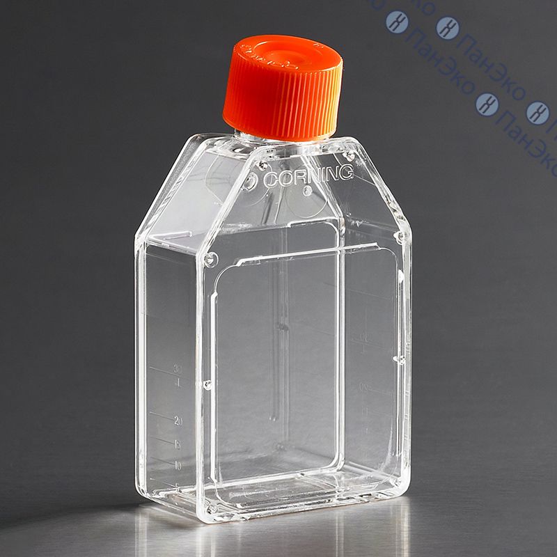 Для культуральных работ. С обработанной поверхностью для прикрепляемых культур клеток. Прямоугольная форма и наклонное горло.