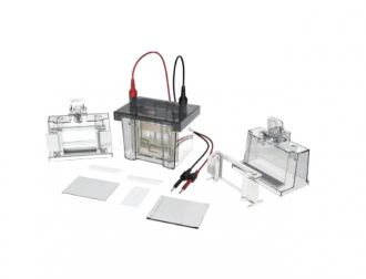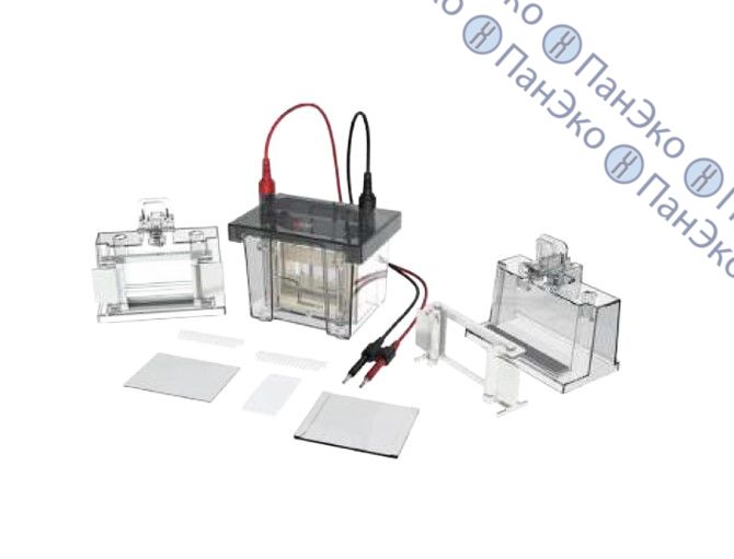 Комплект поставки: вертикальная камера, электроды, 2 гелиевых каркаса, перегородка, толстые стекла, тонкие стекла, 2 подставки для подготовки геля, гребенки (10 и 15 лунок), средство для удаления геля.