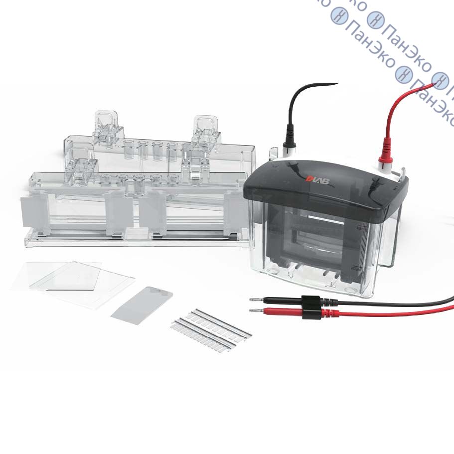 Комплект поставки: вертикальная камера, электроды, 4 гелиевых каркаса, перегородка, толстые стекла, тонкие стекла, 2 подставки для подготовки геля, гребенки, средство для удаления геля.