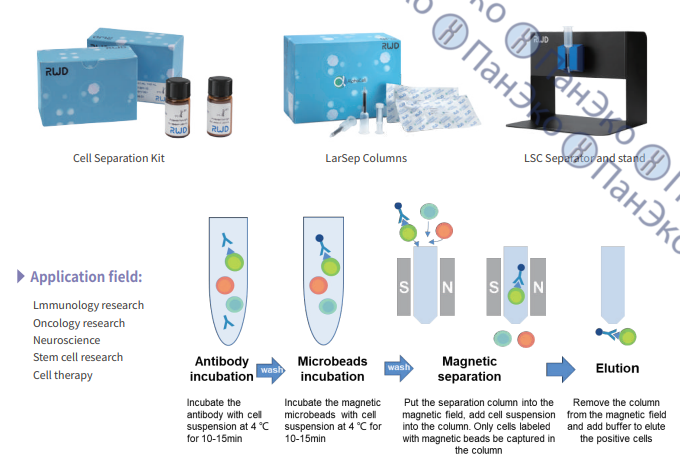 Продукты для разделения клеток RWD включают в себя наборы для разделения клеток с магнитными микрошариками и колонки для разделения клеток, которые позволяют проводить сепарацию с высокой чистотой и высокой жизнеспособностью за счет простой работы. Наноразмерные магнитные шарики не требуют элюции, а разделенные клетки можно напрямую использовать в последующих экспериментах, таких как проточная цитометрия, культивирование клеток, секвенирование отдельных клеток и т.д.