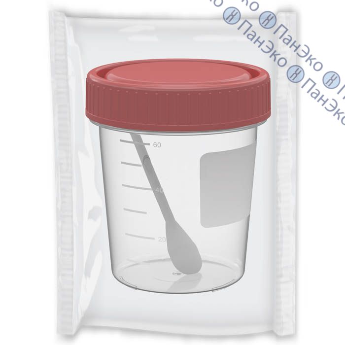 Контейнер 60 мл с ложкой, с красной крышкой, стерильный.