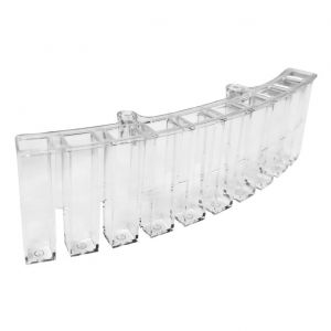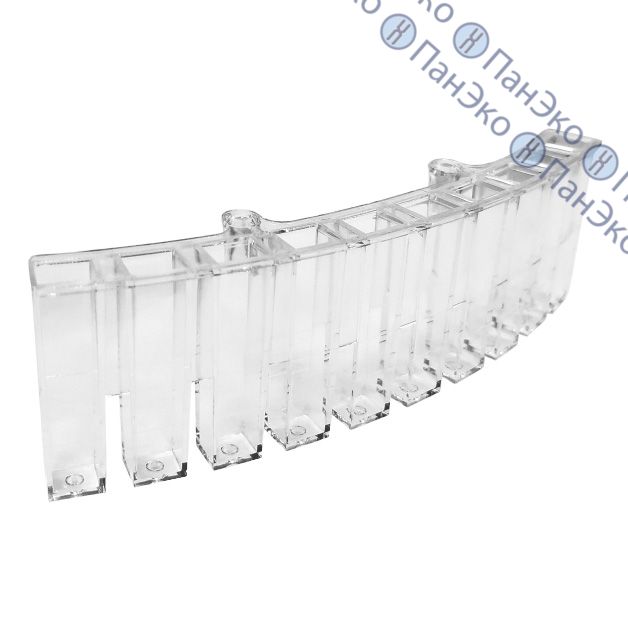 Кюветы из пластика соединенные по 10 штук для применения в биохимической анализаторе при определении оптической плотности. Каждый сегмент имеет по два цилиндрических фиксатора.