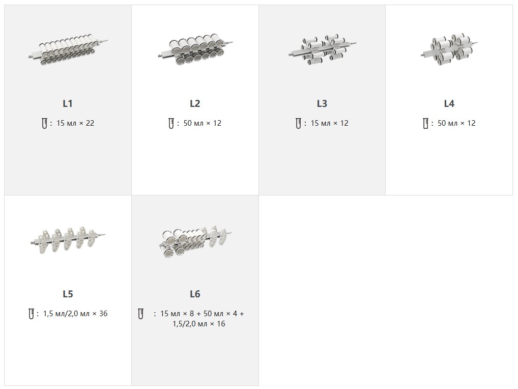 В комплекте с рак-держателем L6 (4х50 мл + 8х15 мл + 16х1,5/2 мл)