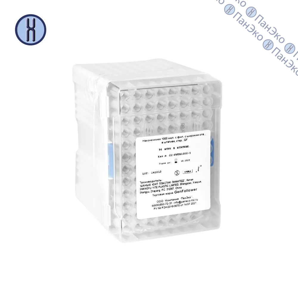 Наконечники, 1000 мкл, с фильтром, с широким отверстием, стерильные, в штативе, GenFollower (В НАЛИЧИИ)