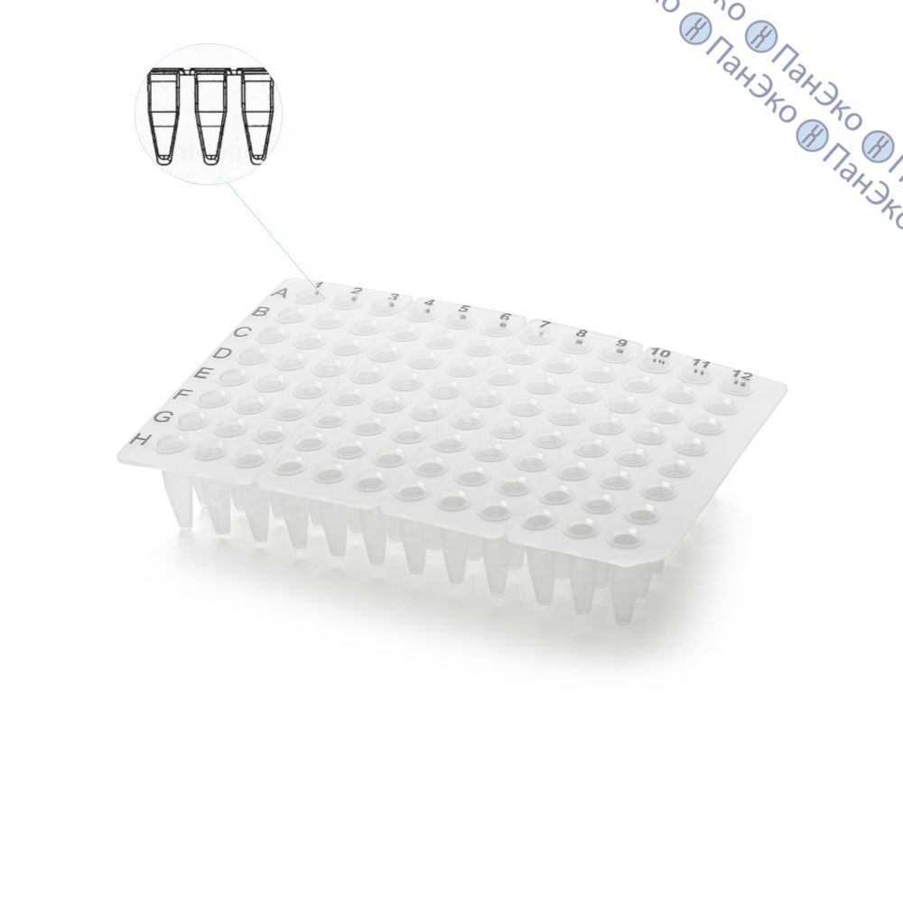 Планшет ПЦР на 96 пробирок без юбки, профиль стандартный (High Profile) (200 мкл), прозрачный, тонкостенный, совместим с большинством амплификаторов и ДНК-секвенаторов. Ультратонкие и однородные стенки планшета обеспечивают быстрый и равномерный теплообмен, приподнятые контуры лунок позволяют добиться герметичности при закрытии планшета. Буквенно-цифровая черного цвета для легкой идентификации лунок. Совместимы со всеми пленками для заклеивания.