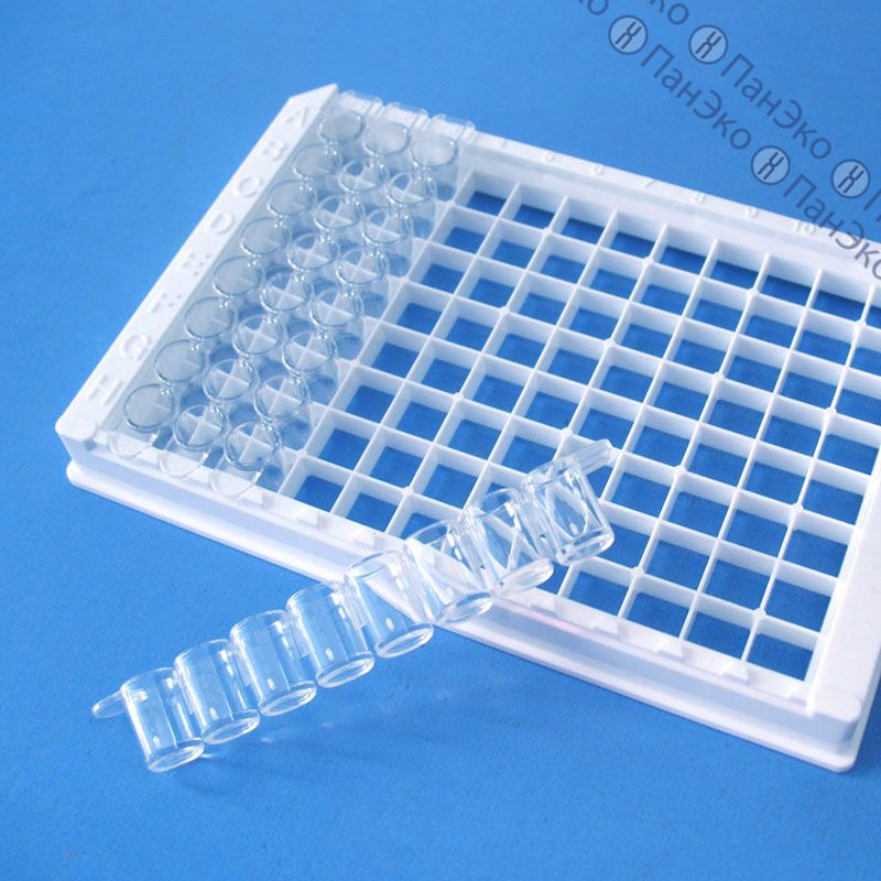 Стрипованный планшет для иммунологических исследований. Высокая адгезия для связывания гидрофильных молекул (белков), а также других биомолекул, имеющих гидрофильные и гидрофобные участки.