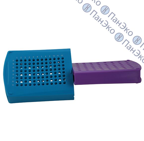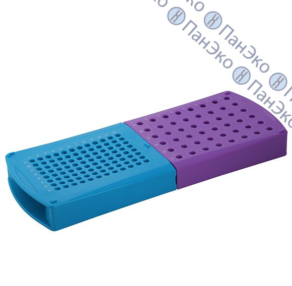 - Фиолетовая половина - 48 ячеек для пробирок 0,5 мл, - синяя половина 96 ячеек для пробирок по 0,2 мл.