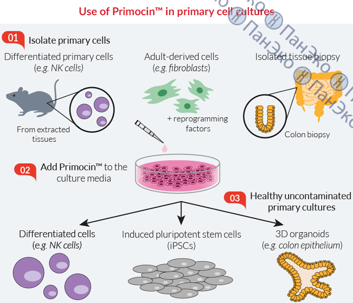 Специализированный препарат для защиты первичных клеточных культур от контаминации микоплазмой, бактериями и грибами. Примоцин безопасен для клеток, при этом эффективен против микроорганизмов. Препарат подходит для использования в большинстве протоколов по выделению первичных культур.