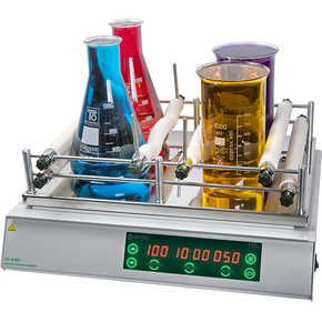 На краях платформы есть специальные направляющие, на которые можно установить валики из резины. Прямые валики нужны для закрепления бутылок и колб, а фигурные — для закрепления воронок в форме груши. Валики фиксируются на направляющих с помощью боковых винтов.