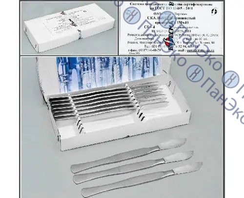 Предназначен для разрезания биологических тканей при проведении операций. Однолезвийный медицинский инструмент с плавно изогнутой округлой режущей кромкой и почти прямым обушком изготовленный из нержавеющей стали, представляющий одно целое с рукояткой.