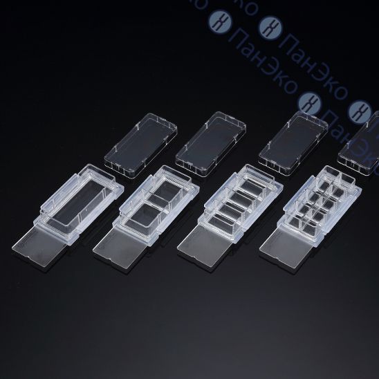 Разборная конструкция без использования клея, легкий демонтаж. Материал камеры - ПС; материал слайда - FLux; материал держателя - ПП. FLux - обработка пластика оптимальная для конфокальной микроскопии.