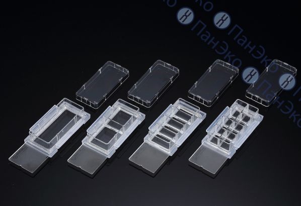 Разборная конструкция без использования клея, легкий демонтаж. Материал камеры - ПС; материал слайда - FLux; материал держателя - ПП. FLux - обработка пластика оптимальная для конфокальной микроскопии.