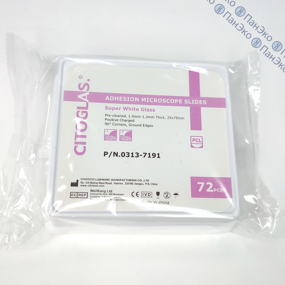 Стекла предметные 75х25х1 мм, позитивно заряженные, со шлифованными краями, с матовым полем, Citotest