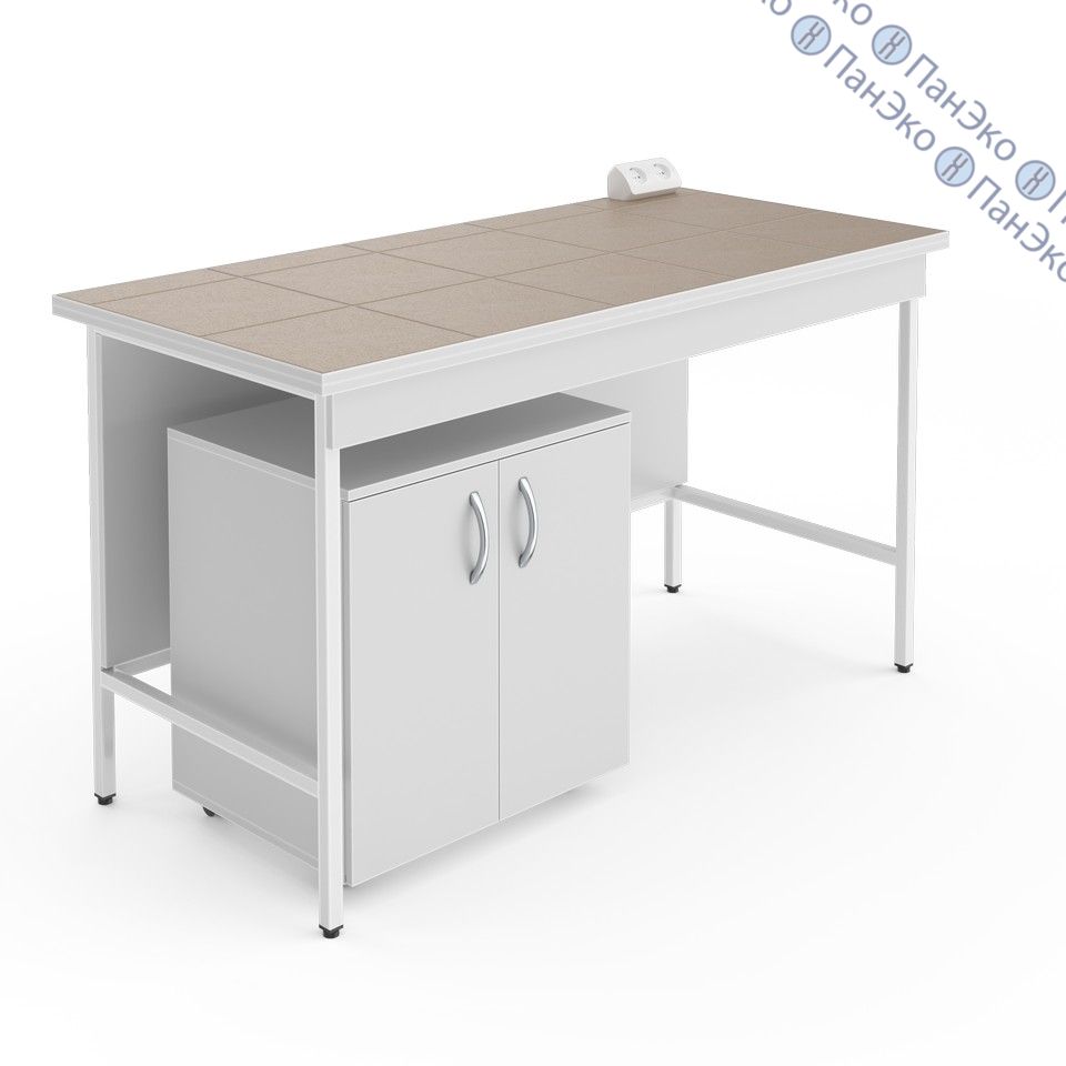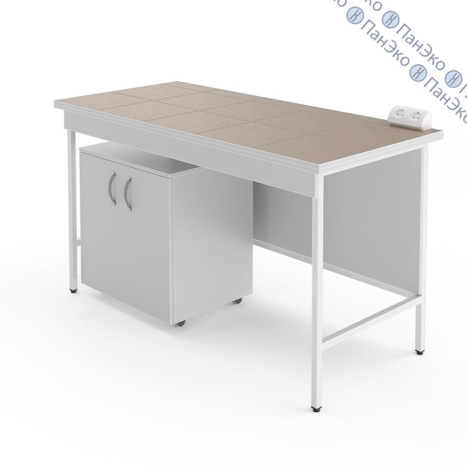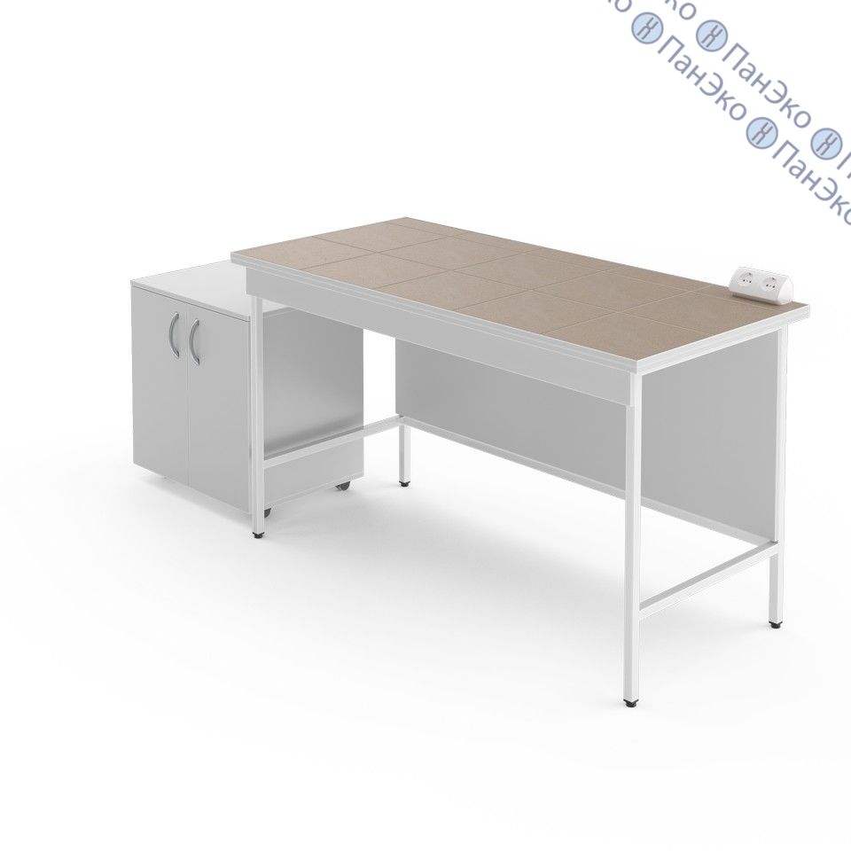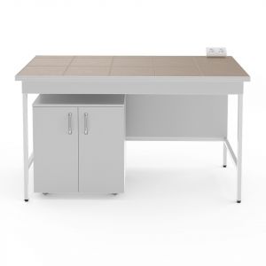 Материал рабочей поверхности: керамогранитная плитка. Она влагостойка и отлично выдерживает высокие температуры. Устойчива к продолжительному воздействию концентрированных кислот, щелочей и органических растворителей. Ограниченно стойка к плавиковой кислоте. Это один из самых популярных видов столешниц для лабораторной мебели.