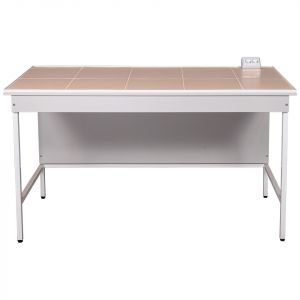Материал рабочей поверхности: керамогранитная плитка. Она влагостойка и отлично выдерживает высокие температуры. Устойчива к продолжительному воздействию концентрированных кислот, щелочей и органических растворителей. Ограниченно стойка к плавиковой кислоте. Это один из самых популярных видов столешниц для лабораторной мебели.