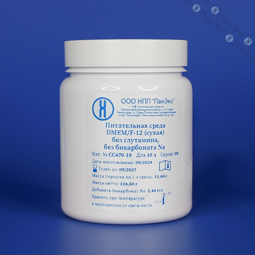 Представляет собой сухую смесь неорганических солей, аминокислот, витаминов, глюкозы и фенолового красного для приготовления раствора. Требует дополнительного введения бикарбоната натрия. Cреда DMEM/F-12 - это смесь питательных сред DMEM и F-12 в соотношении 1:1, но готовится из отдельных компонентов.