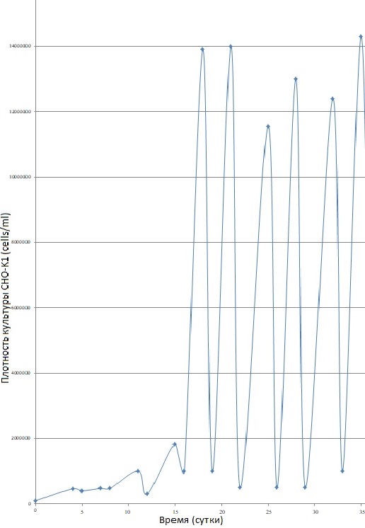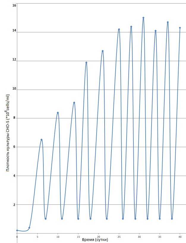 *Используя стартовую концентрацию 4,0-10,0 * 105 кл/мл можно получить максимальные плотности культуры CHO-S уже на 3-4 сутки, в условиях суспензионной культуры. – Для адаптированной линии CHO-S на 3-4 сутки культивирования систематически достигались плотности 1,0 – 1,6*107 кл/мл, без введения дополнительных подпиток.