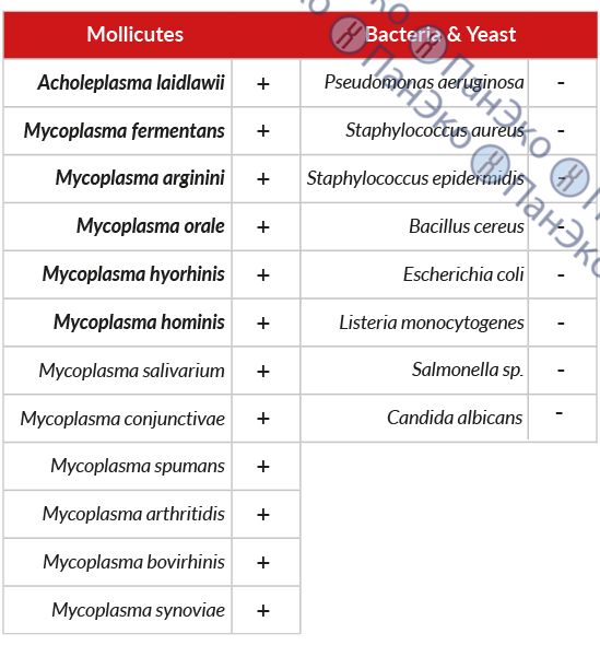 Тест-полоски на 95% эффективны для обнаружения микроорганизмов, наиболее часто контаминирующих клеточные культуры: M. orale, M. hyorhinis, M. arginini, M. fermentans, M. hominis, и A. laidlawii. Тест высокоспецифичен и реагирует на участки ДНК, которые не встречаются у других бактерий и грибов.