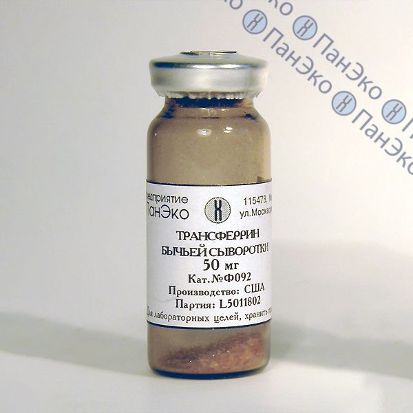 Трансферрин - белок, содержащийся в плазме крови и отвечающий за перенос ионов железа (Fe3+) из внешней среды внутрь клетки. Кроме того, трансферрин обладает бактерицидным свойством, т.к. делает железо недоступным для бактерий.