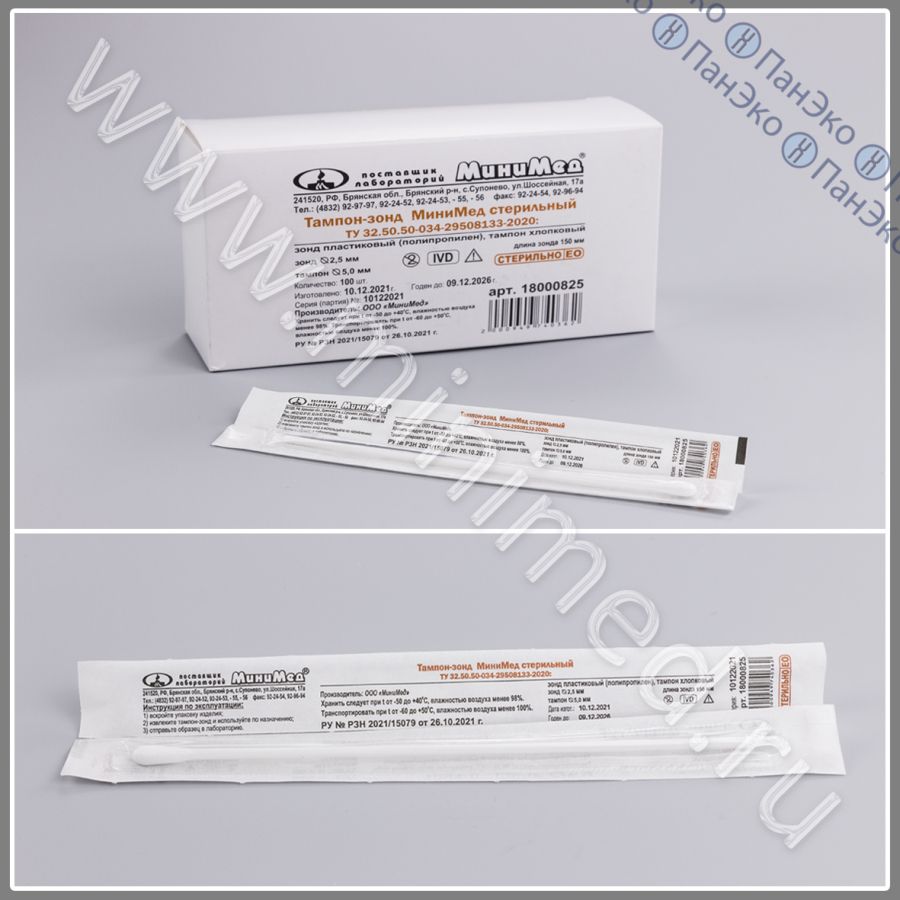 Зонд-тампон, хлопок+пластик, 150 мм, стерильный, ИУ, Минимед